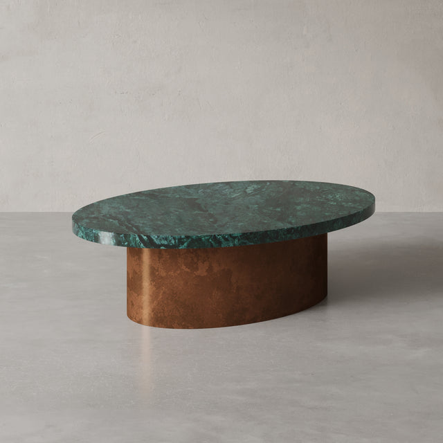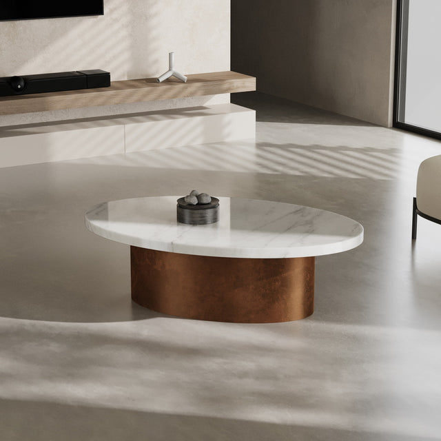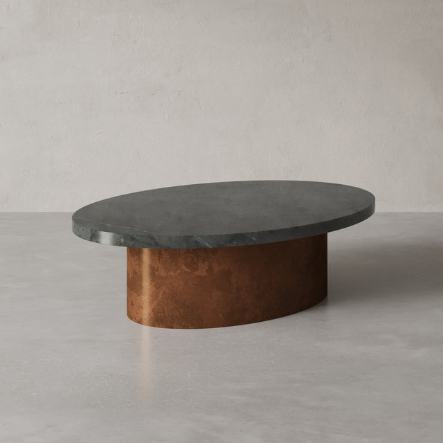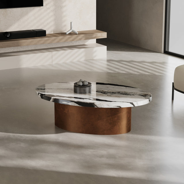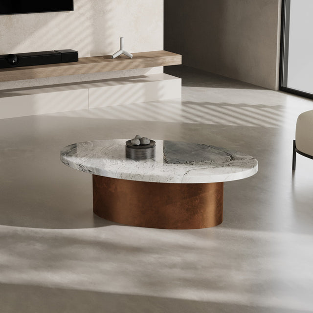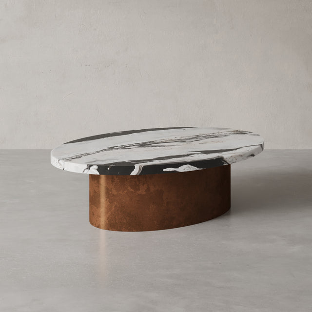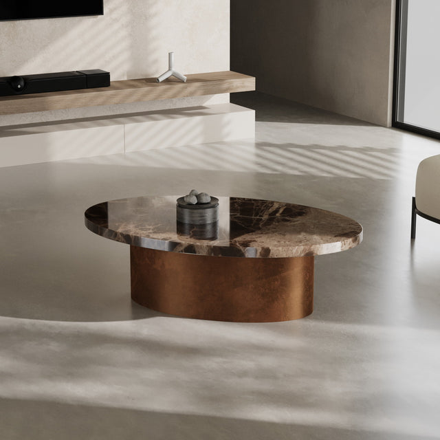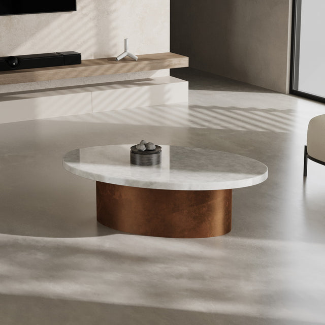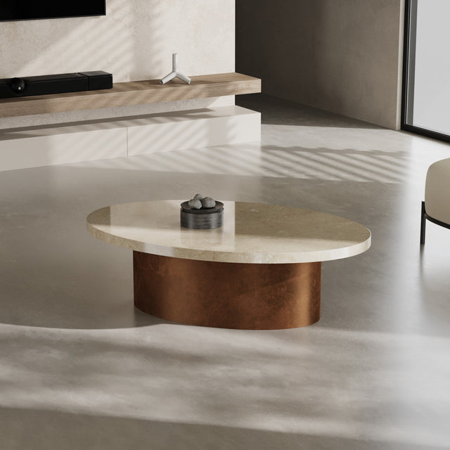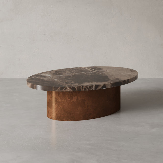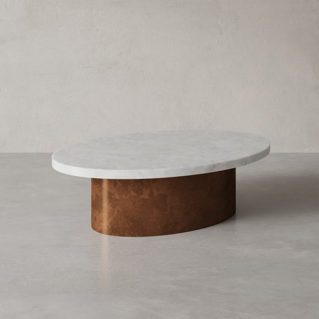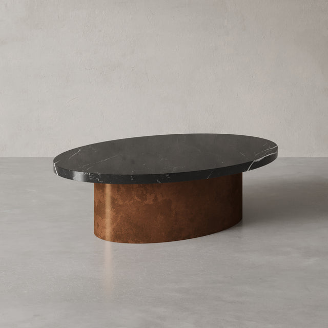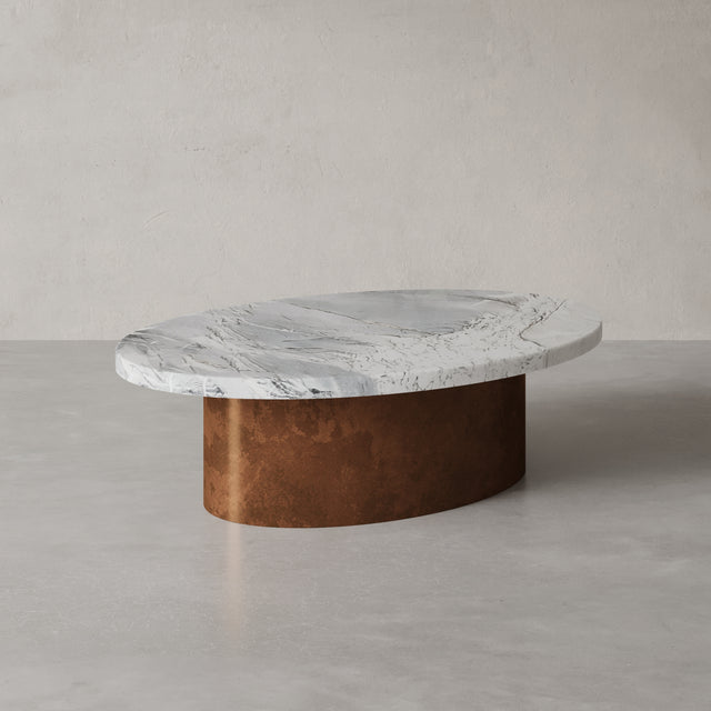 Unser Modell "Lombok" ist ein luxuriöser und zeitloser Couchtisch, der durch die harmonische Verbindung von minimalistischer Formensprache und hochwertigen Materialien überzeugt. Die elegante Tischplatte aus feinstem Marmor ruht auf einem kunstvoll gefertigten Gestell aus Messing/Cortenstahl, dessen warme Rostoptik einen spannenden Kontrast zur kühlen Eleganz des Marmors bildet.