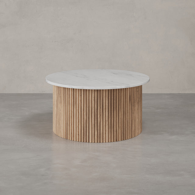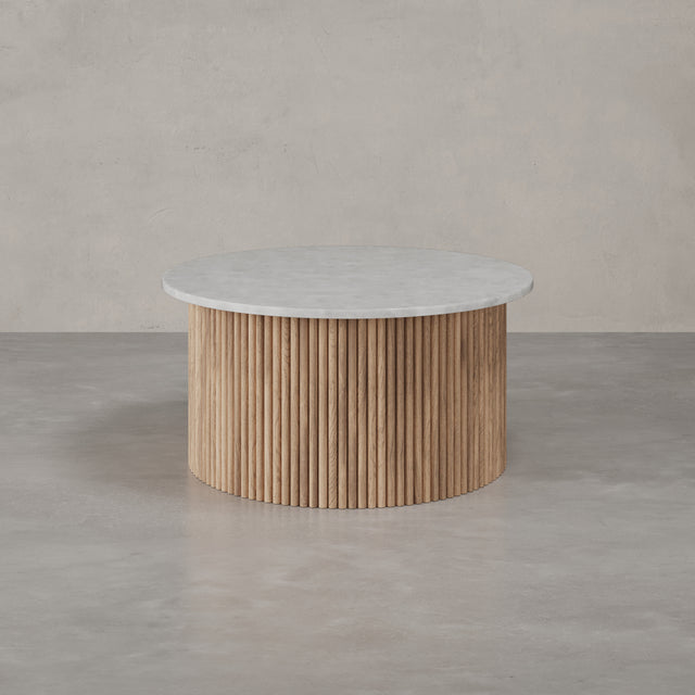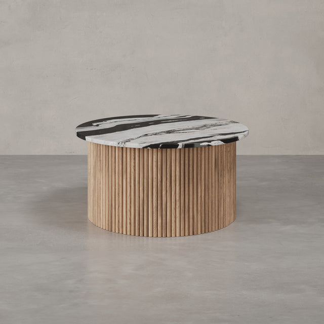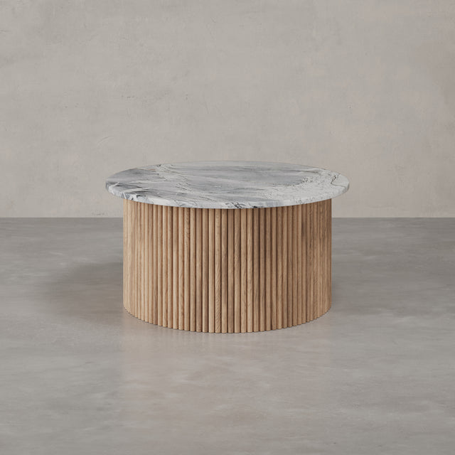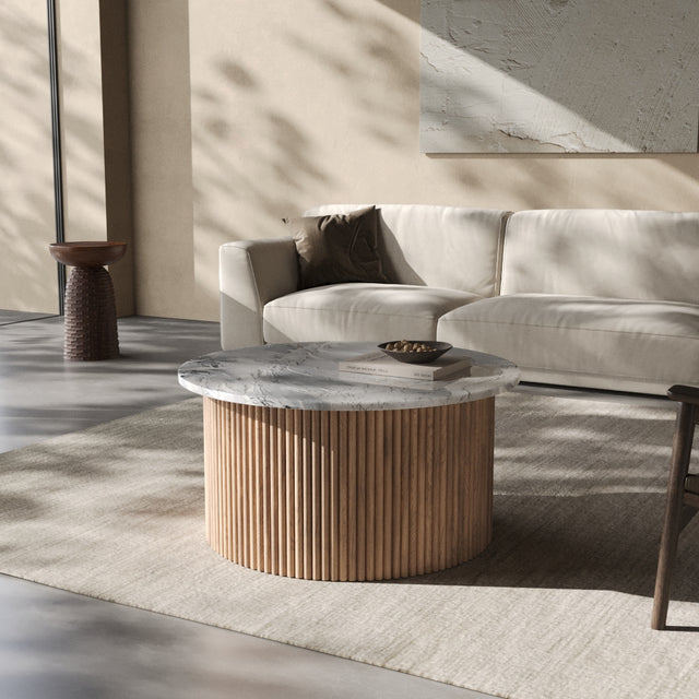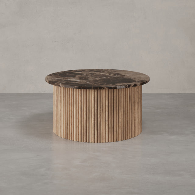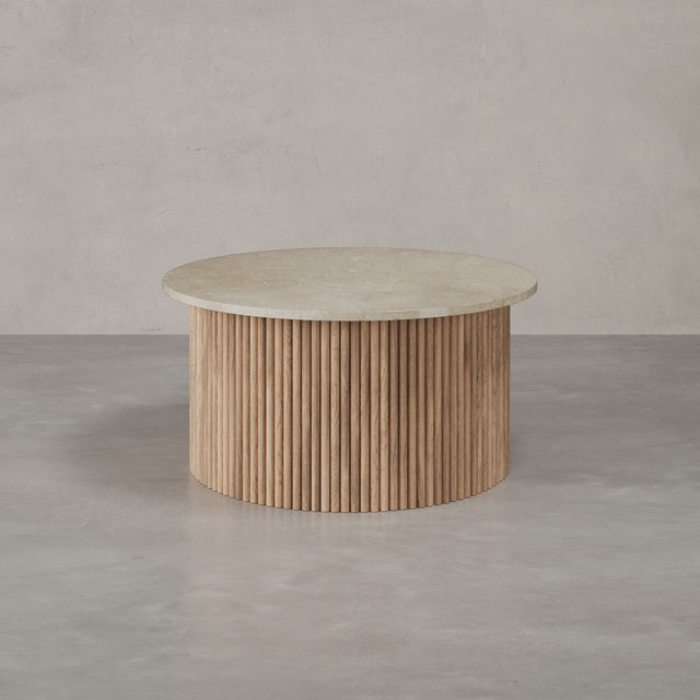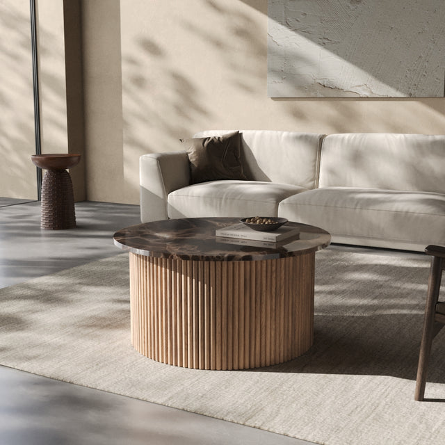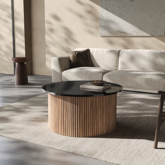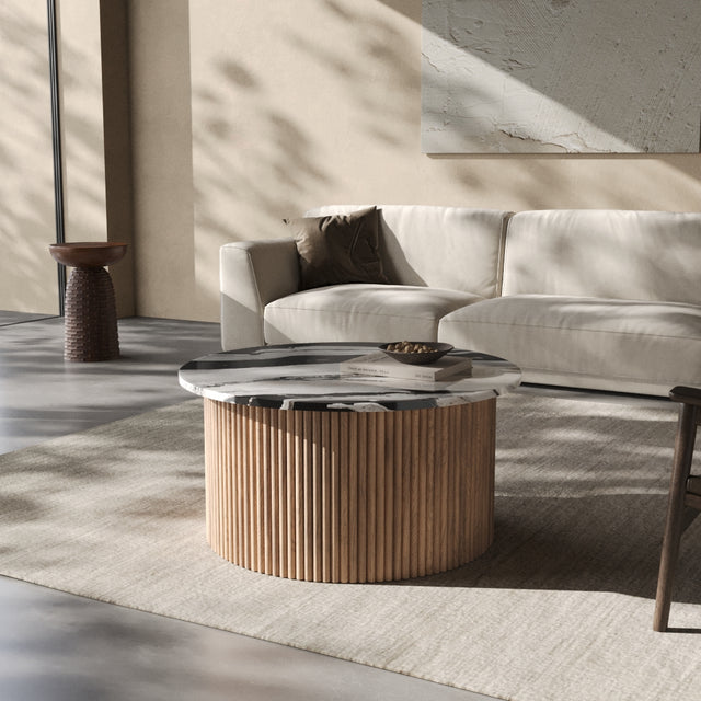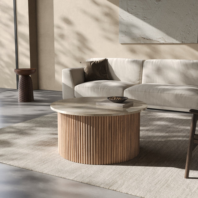 Der Couchtisch “Victoria” trägt den Namen einer Stadt, die für ihre gelassene Eleganz und ihre Nähe zur Natur bekannt ist. Auf Vancouver Island gelegen, vereint Victoria britisches Erbe mit der Ruhe des Pazifiks – ein Ort, an dem klassische Architektur und wilde Landschaft harmonisch nebeneinander bestehen. Genau dieses Spannungsfeld spiegelt sich im Design der Victoria Linie wider: Eine runde Natursteinplatte mit faszinierender Maserung ruht auf einem skulpturalen Korpus aus vertikalen Holzlamellen. Kühl und erhaben wirkt der Stein, warm und lebendig das Holz – zusammen bilden sie ein Möbelstück, das zeitlose Eleganz und natürliche Ursprünglichkeit miteinander verbindet.