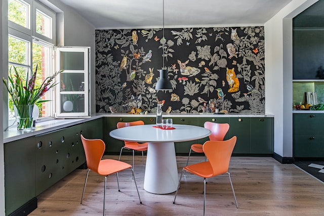 Ein weiterer Tipp ist es, Fokuspunkte im Raum zu betonen. Einen Fokuspunkt können Sie schaffen, indem Sie etwa einen exklusiven Esstisch in der Nähe einer natürlichen oder künstlichen Lichtquelle platzieren und auf diesen ein schickes Tablett oder eine Blumenvase stellen.