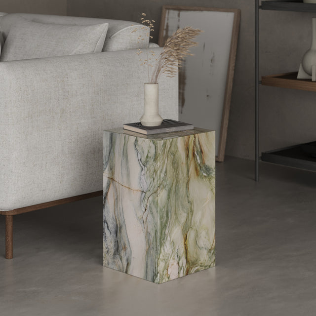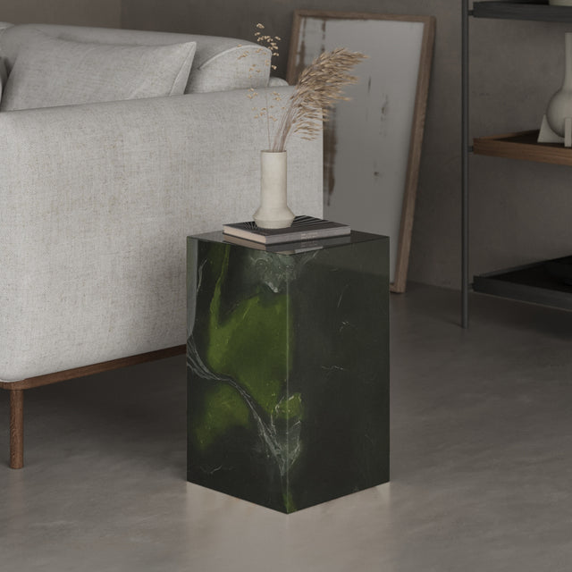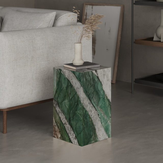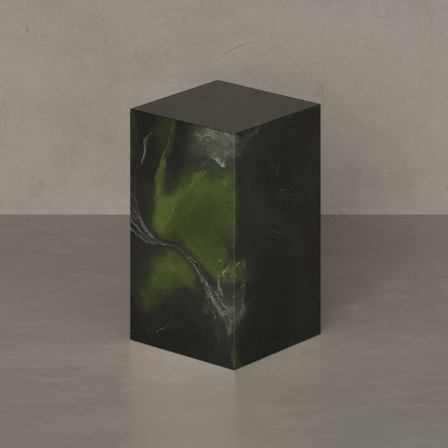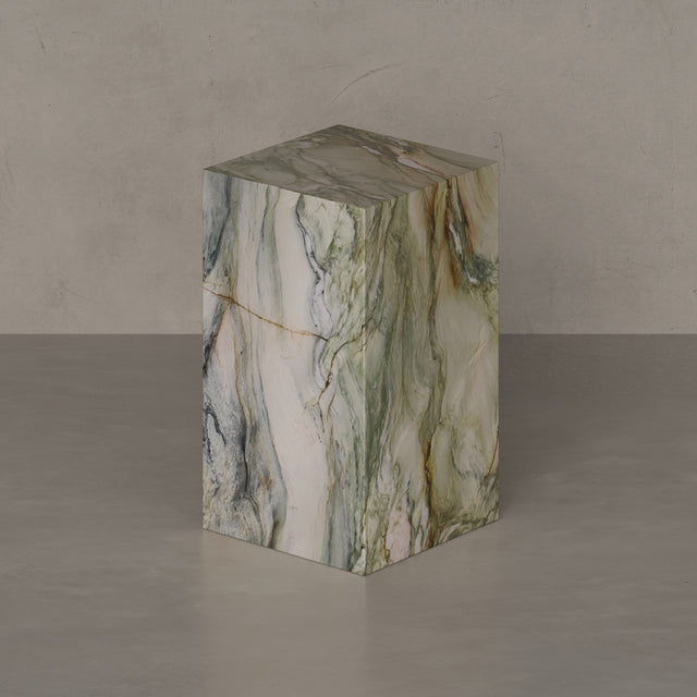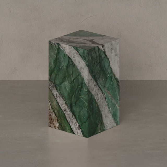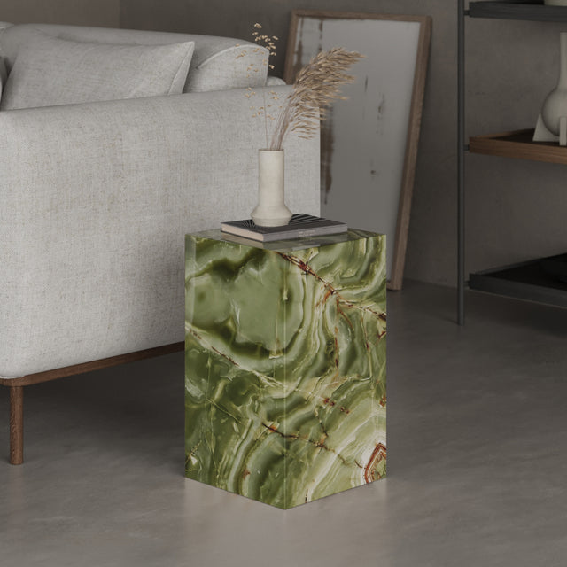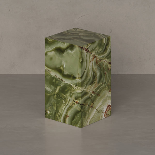 Der Green Onyx wird im Iran abgebaut und ist jünger als 1 Million Jahre. Dieser kristalline Naturstein besticht durch seine unverwechselbare Ästhetik, die von weißen, goldenen und ockerfarbenen Adern durchzogen ist. Bitte beachten Sie, dass der Green Onyx empfindlich gegenüber Säuren ist; wir empfehlen daher stets die Verwendung eines Untersetzers für Getränke und Speisen, um seine Schönheit zu bewahren.