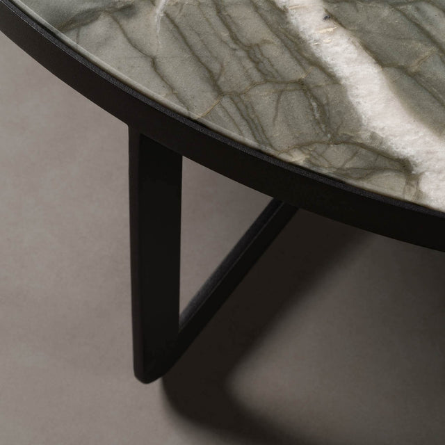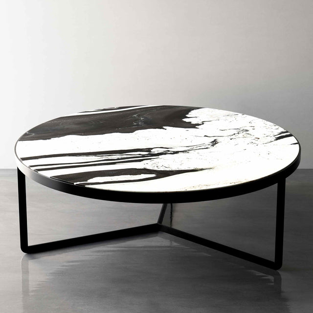Unser Modell "Osaka" ist ein moderner und futuristischer Couchtisch. Der runde Couchtisch mit mattschwarzem Gestell, das überwiegend aus recyceltem Metall hergestellt wurde, und einem echten Naturstein Ihrer Wahl kann der neue Blickfang in jedem Raum werden.
