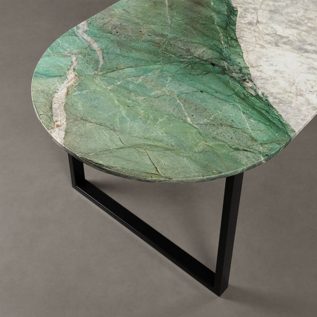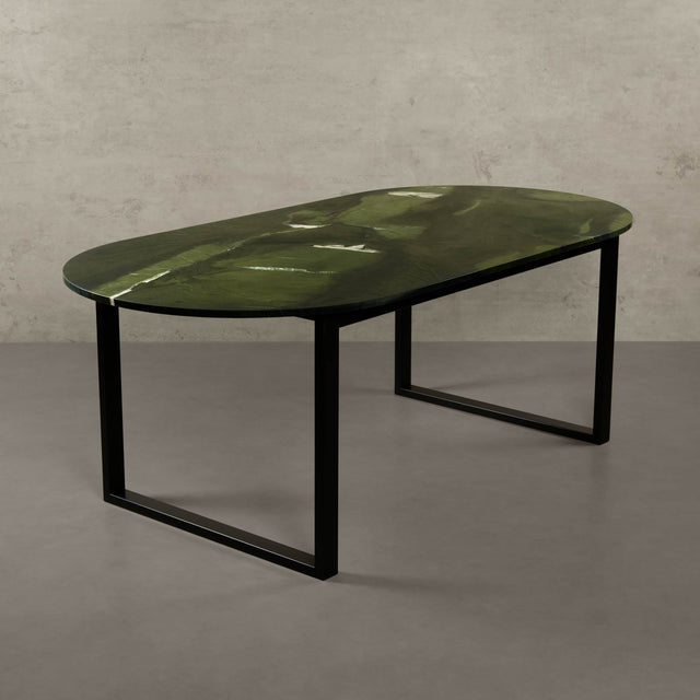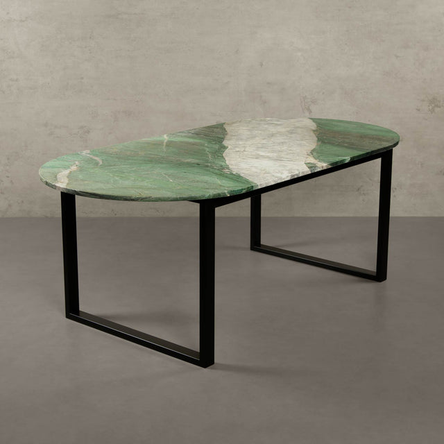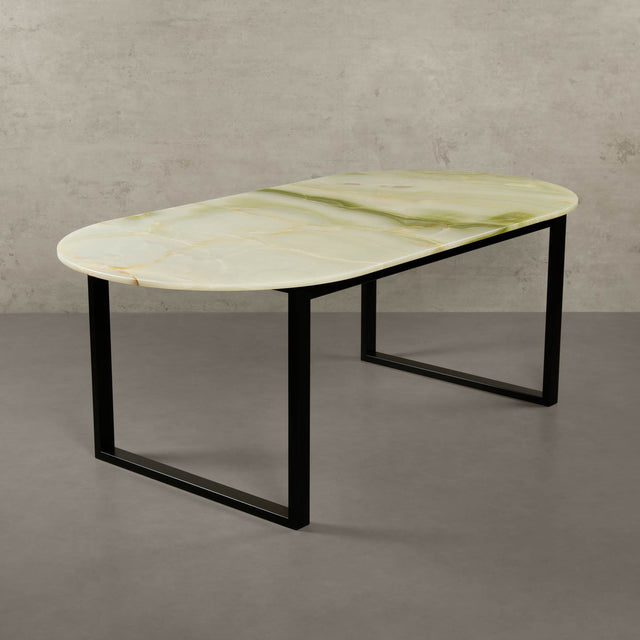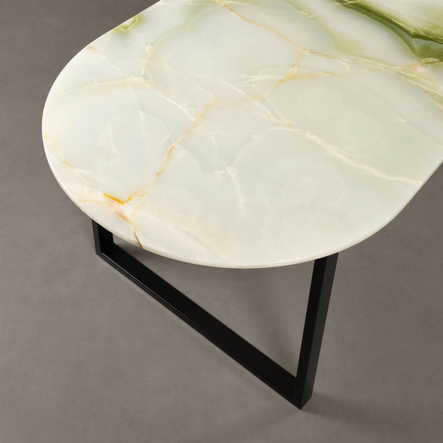 Der Green Onyx wird im Iran abgebaut und ist jünger als 1 Million Jahre. Dieser kristalline Naturstein besticht durch seine unverwechselbare Ästhetik, die von weißen, goldenen und ockerfarbenen Adern durchzogen ist. Bitte beachten Sie, dass der Green Onyx empfindlich gegenüber Säuren ist; wir empfehlen daher stets die Verwendung eines Untersetzers für Getränke und Speisen, um seine Schönheit zu bewahren.