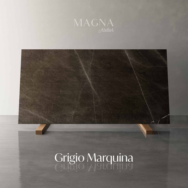 Ein grauer Kalkstein, der bereits über 310 Millionen Jahre alt ist und aus dem Iran stammt. Die  dunkelgraue Grundfarbe mit markanten weißen und hellgrauen Adern ist typisch für Grigio Marquina Marmor und verleihen ihm ein dramatisches und elegantes Erscheinungsbild.