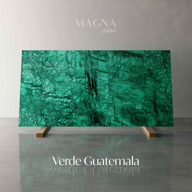 Ein tiefgrüner und 163 Millionen Jahre alter Naturstein aus Indien. Verde Guatemala Marmor zeigt eine lebendige, gleichmäßige Grüntöne, die ihm ein charaktervolles und ästhetisch ansprechendes Aussehen verleihen. Um seine Schönheit langfristig zu bewahren, ist es wichtig, direkten Kontakt mit Speisen und Getränken zu vermeiden, da er empfindlich gegenüber Säuren ist.