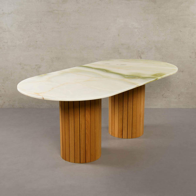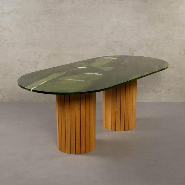 Der Green Onyx wird im Iran abgebaut und ist jünger als 1 Million Jahre. Dieser kristalline Naturstein besticht durch seine unverwechselbare Ästhetik, die von weißen, goldenen und ockerfarbenen Adern durchzogen ist. Bitte beachten Sie, dass der Green Onyx empfindlich gegenüber Säuren ist; wir empfehlen daher stets die Verwendung eines Untersetzers für Getränke und Speisen, um seine Schönheit zu bewahren.