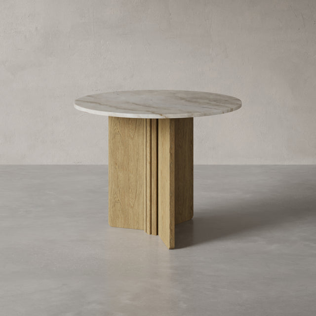 Der Esstisch WING von MAGNA Atelier verbindet natürliche Schönheit mit modernem Design und überzeugt durch seine harmonische Kombination aus massivem Eichenholz und dem edlen Naturstein Taj Mahal. Die runde Tischplatte aus dem exklusiven Taj Mahal Naturstein zeichnet sich durch ihre einzigartige Maserung und dezente Farbtöne aus, die Wärme und Eleganz ausstrahlen. Unterstützt wird diese außergewöhnliche Tischplatte durch ein skulpturales Gestell aus hochwertigem, massivem Oak Wood (Eichenholz).