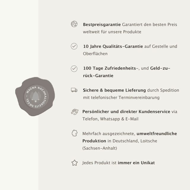 MAGNA Glaskeramik ist ein weltweit einzigartiges und mehrfach ausgezeichnetes Design-Material, das wir nachhaltig in Deutschland aus re- & upcycelten Glasscherben herstellen. Jedes Produkt ist eine exklusive Sonderanfertigung, die mit Ihrer Wunschfarbe der Glaskeramik in unserer umweltfreundlichen Produktion in Deutschland für Sie gefertigt wird. Jedes Objekt ist aufgrund der stets unterschiedlichen Verschmelzung hunderter Glasscherben immer ein Unikat, das es so nur einmal auf der Welt gibt.