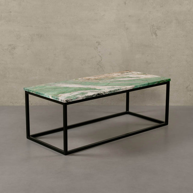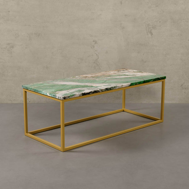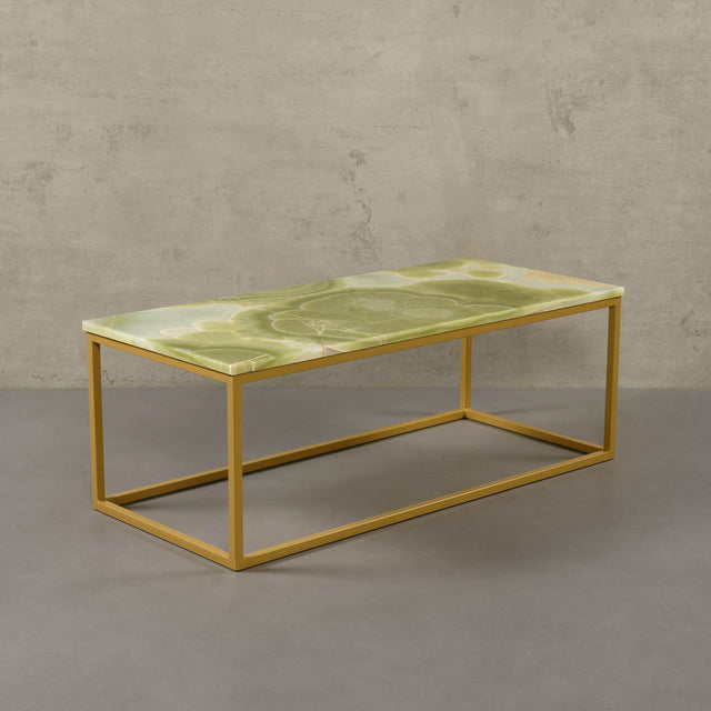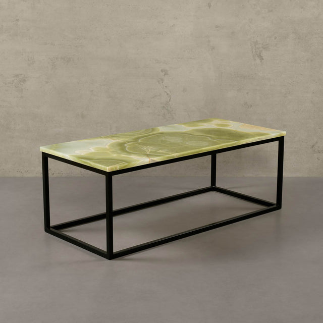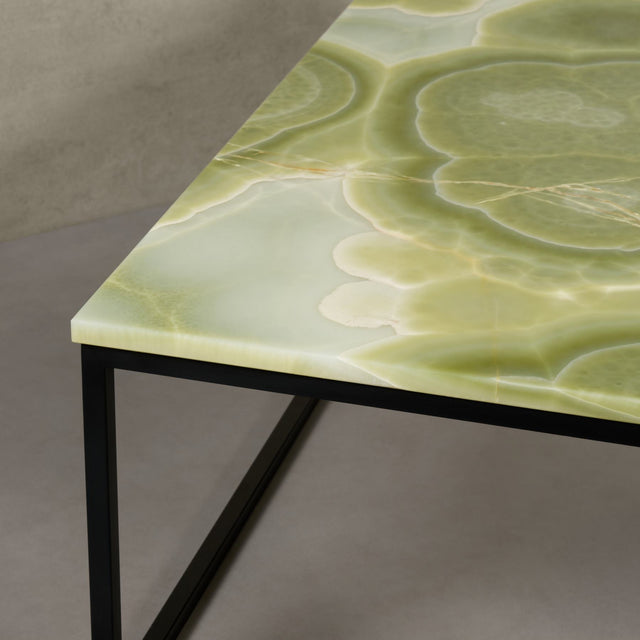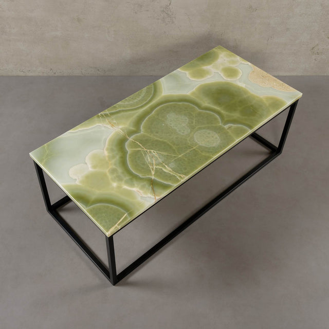 Der Green Onyx wird im Iran abgebaut und ist jünger als 1 Million Jahre. Dieser kristalline Naturstein besticht durch seine unverwechselbare Ästhetik, die von weißen, goldenen und ockerfarbenen Adern durchzogen ist. Bitte beachten Sie, dass der Green Onyx empfindlich gegenüber Säuren ist; wir empfehlen daher stets die Verwendung eines Untersetzers für Getränke und Speisen, um seine Schönheit zu bewahren.