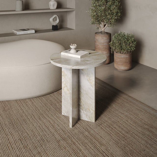 Der Beistelltisch “Lugano” vereint klare Geometrie mit eleganter Leichtigkeit. Zwei gekreuzte Platten aus Naturstein bilden das tragende Gestell und lassen die runde Tischfläche fast schwebend erscheinen. Inspiriert vom schweizerischen Lugano, wo alpine Klarheit und mediterrane Leichtigkeit zusammentreffen, strahlt dieses Design zugleich Ruhe und Raffinesse aus. Ein stiller Akzent, der jeden Raum veredelt.