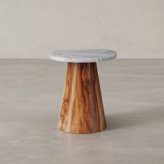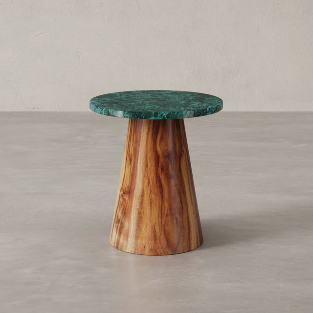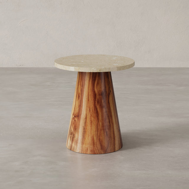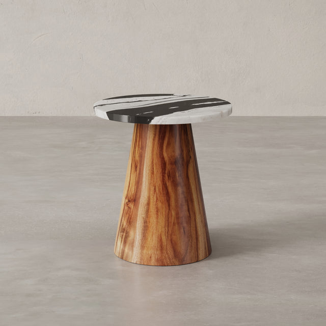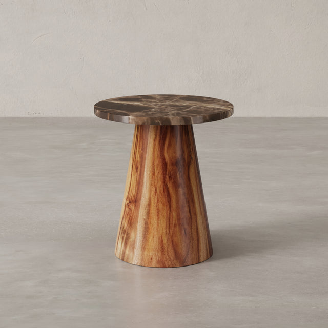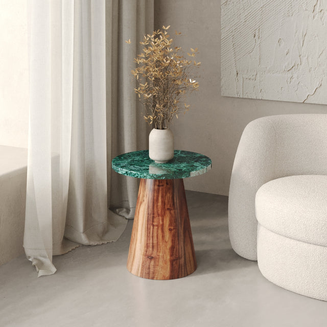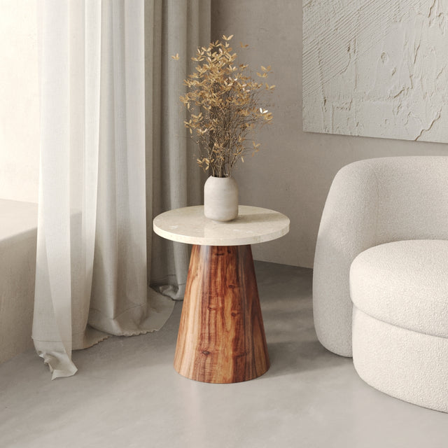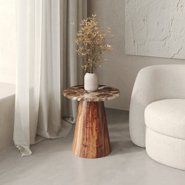 Der Beistelltisch “Manaus” ist inspiriert von den tropischen Wäldern Brasiliens. Sein konisches Gestell aus Holz erinnert an den Stamm eines Baumes, fest verwurzelt und kraftvoll, während die runde Steinplatte wie ein Blätterdach auf ihm ruht. Ein Design, das Naturverbundenheit und urbane Exotik verbindet – Manaus bringt die Seele des Regenwaldes in Ihr Interieur.