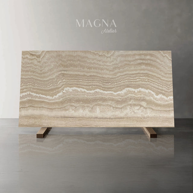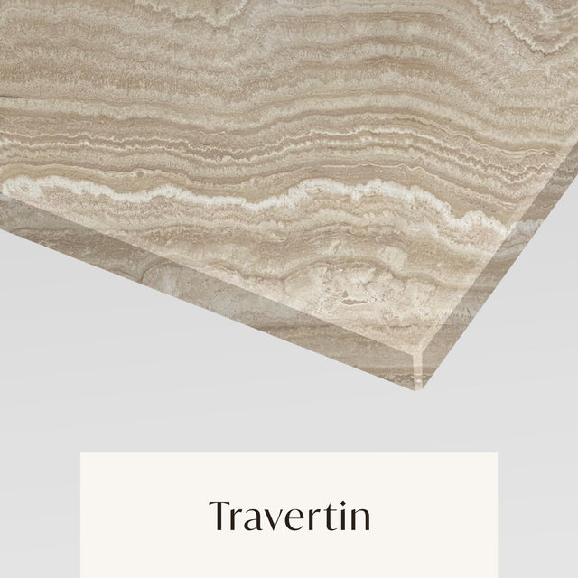Für dieses Modell verwenden wir hochwertigen Travertin in gespachtelter Ausführung. Durch das fachmännische Verschließen der natürlichen Poren entsteht eine besonders ruhige, harmonische Oberfläche, die gleichzeitig robust, pflegeleicht und angenehm glatt ist. Travertin ist ein warmtoniger Naturstein, der über Millionen von Jahren durch natürliche Kalksteinablagerungen entsteht. Jede Tafel weist individuelle Schichtungen, Einschüsse und Farbnuancen auf – Merkmale, die jedes Möbelstück zu einem unverwechselbaren Unikat machen. Bei der gespachtelten Verarbeitung bleibt der natürliche Charakter des Steins erhalten, während die Oberfläche ein moderneres, puristischeres Erscheinungsbild erhält. Unsere Steinexperten wählen für jedes Möbelstück sorgfältig den schönsten und ausgewogensten Bereich einer Steintafel aus. Bitte beachten Sie, dass die abgebildeten Produktfotos als Referenz dienen. Farbe, Maserung und Struktur können leicht variieren – typisch für echten Naturstein und Ausdruck seiner einzigartigen Entstehungsgeschichte.