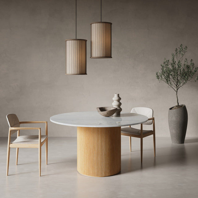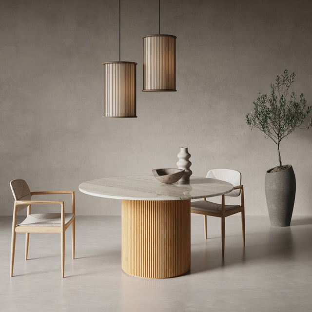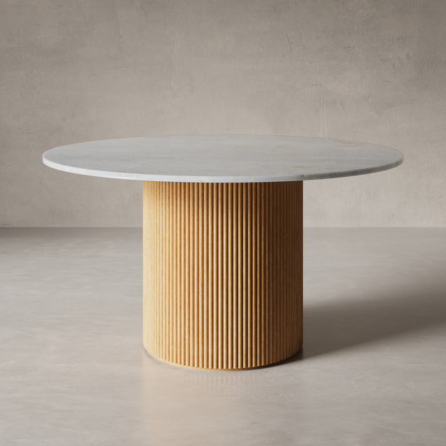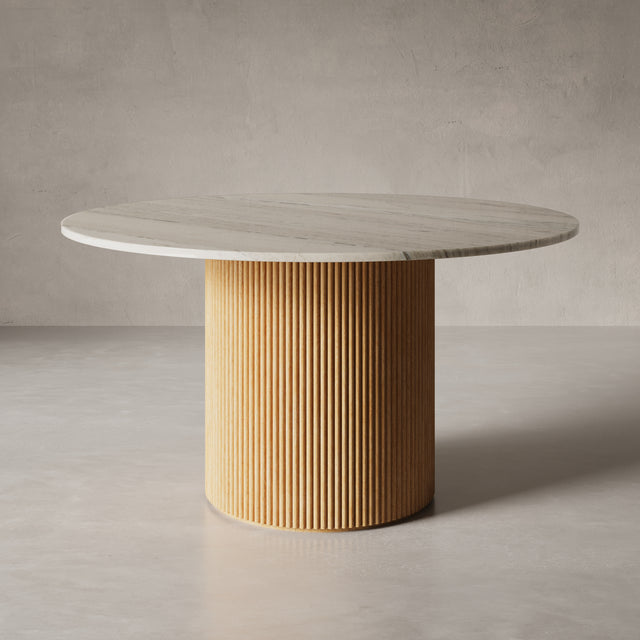 Das massive, fein gerillte Zylindergestell des Victoria ist ein Meisterstück handwerklicher Präzision. Jede Lamelle wird einzeln gefertigt, sodass eine harmonische, fließende Oberfläche entsteht, die Stabilität und Eleganz perfekt vereint. Zusammen mit der runden Natursteinplatte entsteht eine Komposition, die gleichzeitig modern-minimalistisch und zeitlos wirkt.