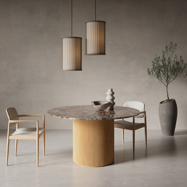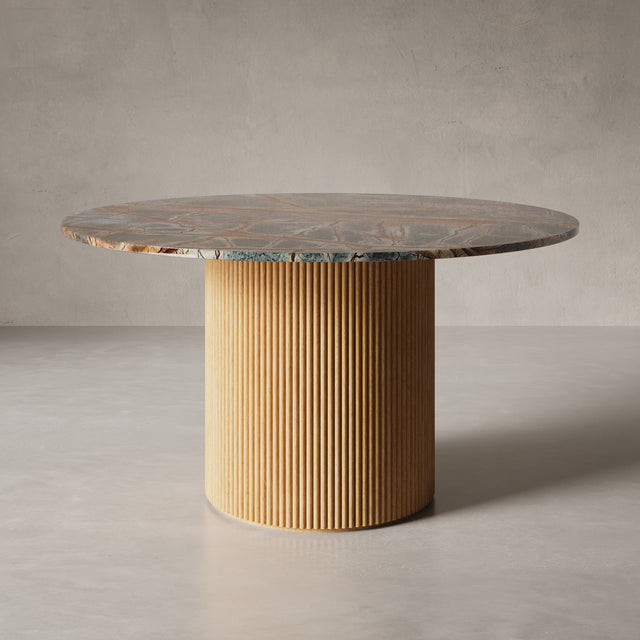 In der Limited Edition präsentiert sich der Victoria Esstisch in seiner luxuriösesten Form. Die charakteristische runde Tischplatte und das markante, vertikal gerillte Holzgestell verleihen dem Design eine skulpturale Präsenz – modern, warm und architektonisch klar. In dieser Edition trifft das ikonische Victoria-Design auf außergewöhnlich seltene Natursteine, die ausschließlich für begrenzte Zeit verfügbar sind: Materialien mit warmen karamellisierten Adern, wolkigen Blautönen oder tiefen, erdigen Strukturen.
