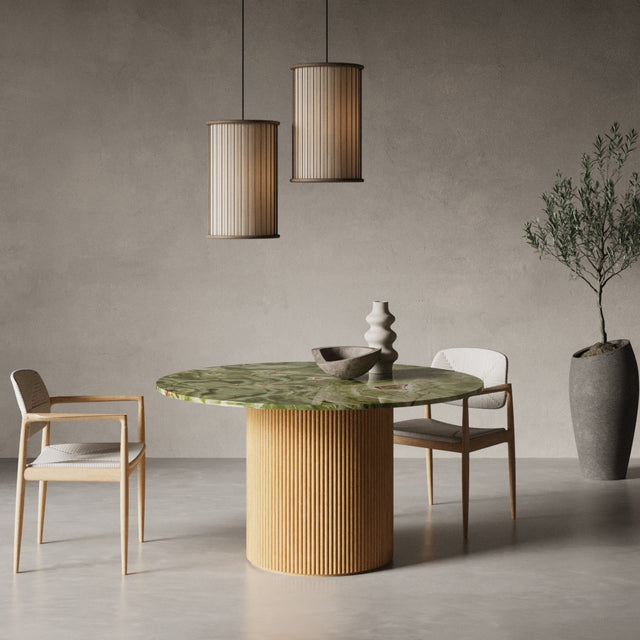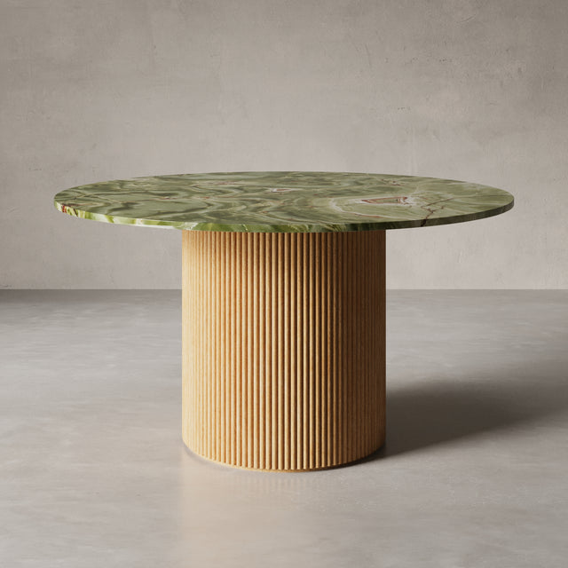 Der Green Onyx wird im Iran abgebaut und ist jünger als 1 Million Jahre. Dieser kristalline Naturstein besticht durch seine unverwechselbare Ästhetik, die von weißen, goldenen und ockerfarbenen Adern durchzogen ist. Bitte beachten Sie, dass der Green Onyx empfindlich gegenüber Säuren ist; wir empfehlen daher stets die Verwendung eines Untersetzers für Getränke und Speisen, um seine Schönheit zu bewahren.