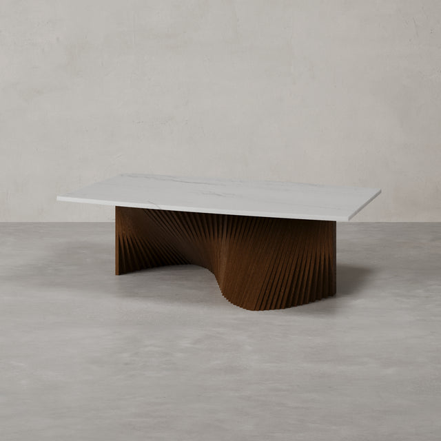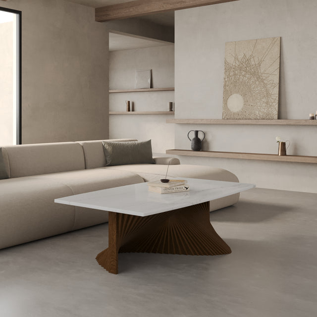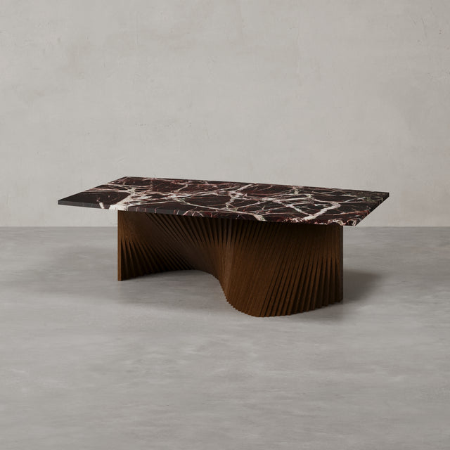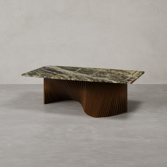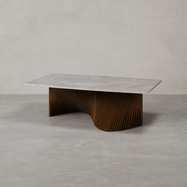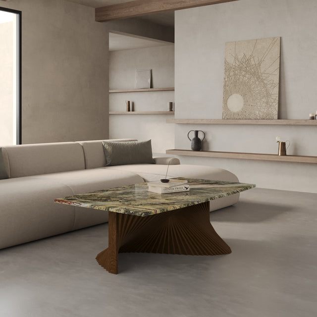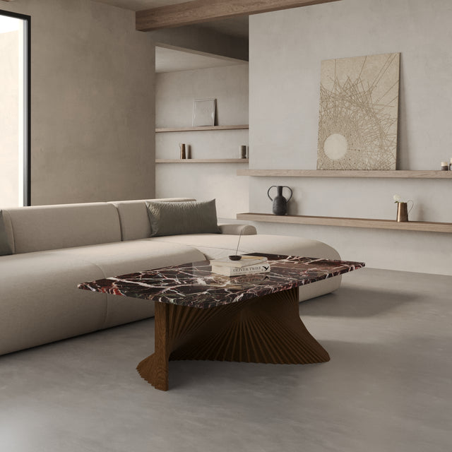 Die präzise gefertigte Natursteinplatte ruht auf dem geschwungenen Holzsockel und bildet einen spannungsvollen Kontrast zwischen weicher, organischer Form und klarer Geometrie. So entsteht ein Couchtisch mit außergewöhnlicher Präsenz – zugleich funktionales Möbelstück und skulpturales Statement.