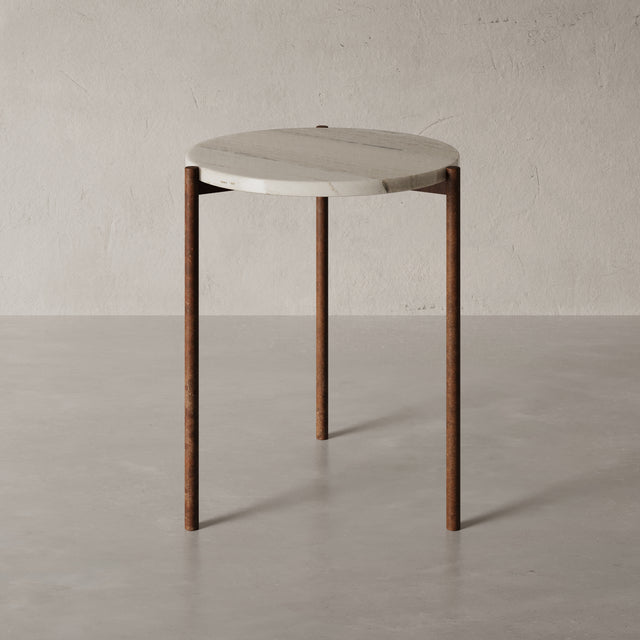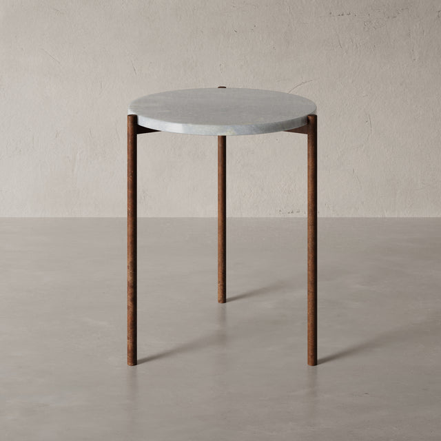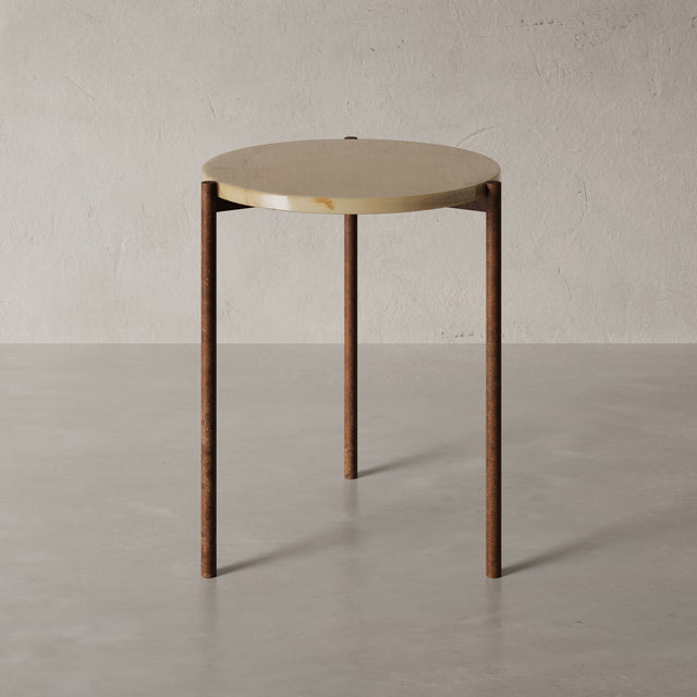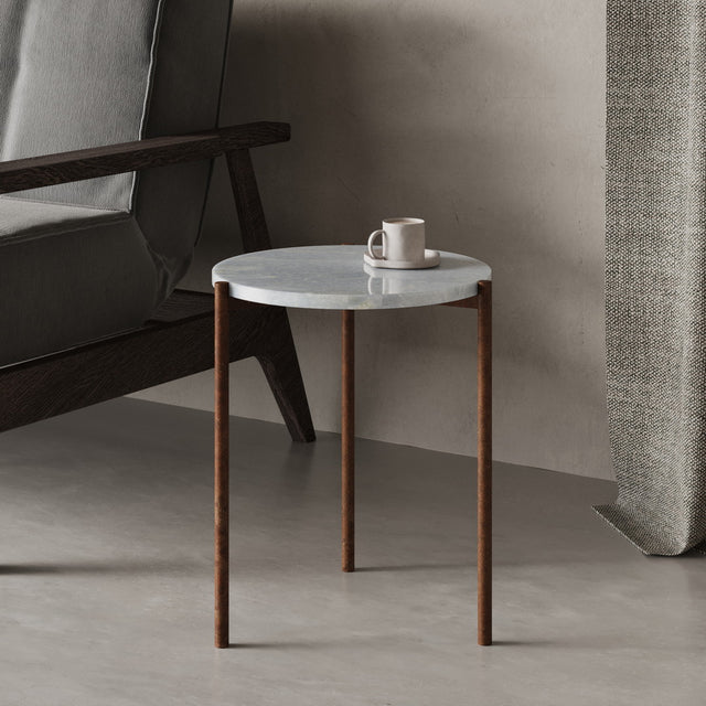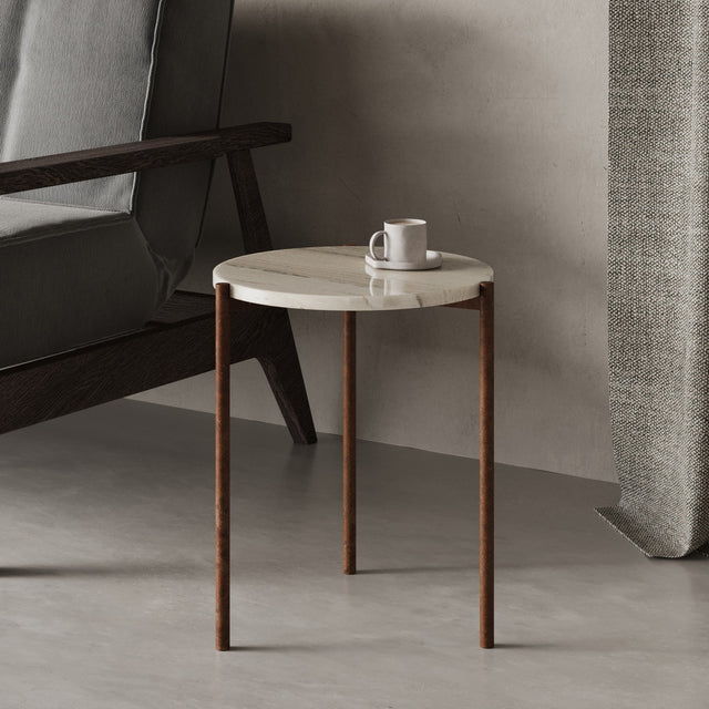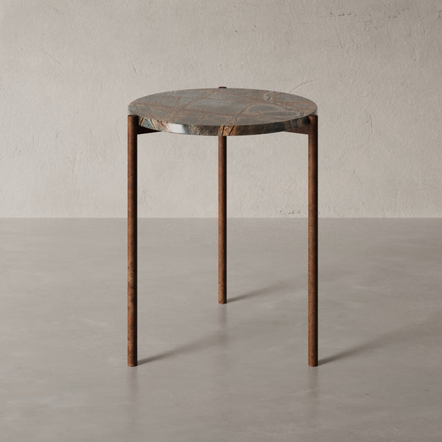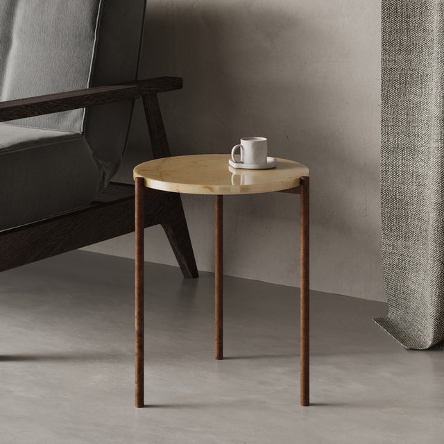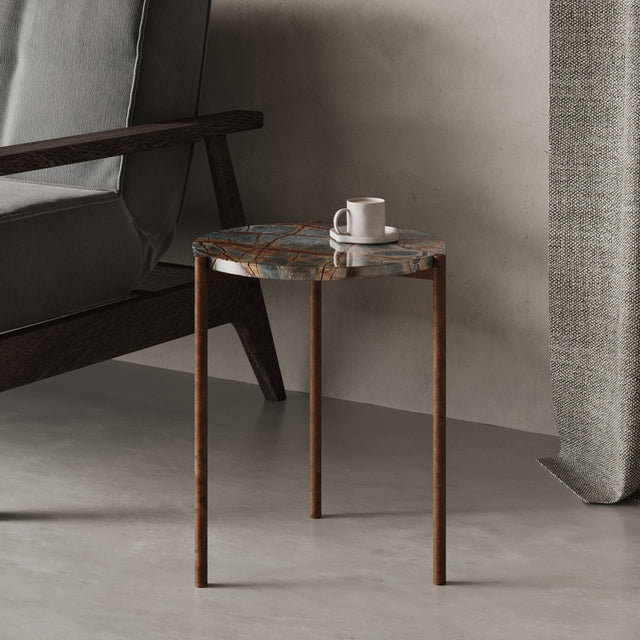 Durch die kompakte Form (45 × 45 × 52 cm) eignet sich der ROM ideal als hochwertiger Beistelltisch neben Sofa, Sessel oder Bett. Die präzise geschliffene Steinplatte ruht auf einem handgeschweißten Metallgestell in Rostoptik, das durch seine schlanke Silhouette eine fast schwebende Leichtigkeit erzeugt. Der Kontrast zwischen schwerem Naturstein und feiner Metallstruktur verleiht dem ROM seine charakteristische, moderne Eleganz – ein kleiner Tisch mit großer Wirkung.
