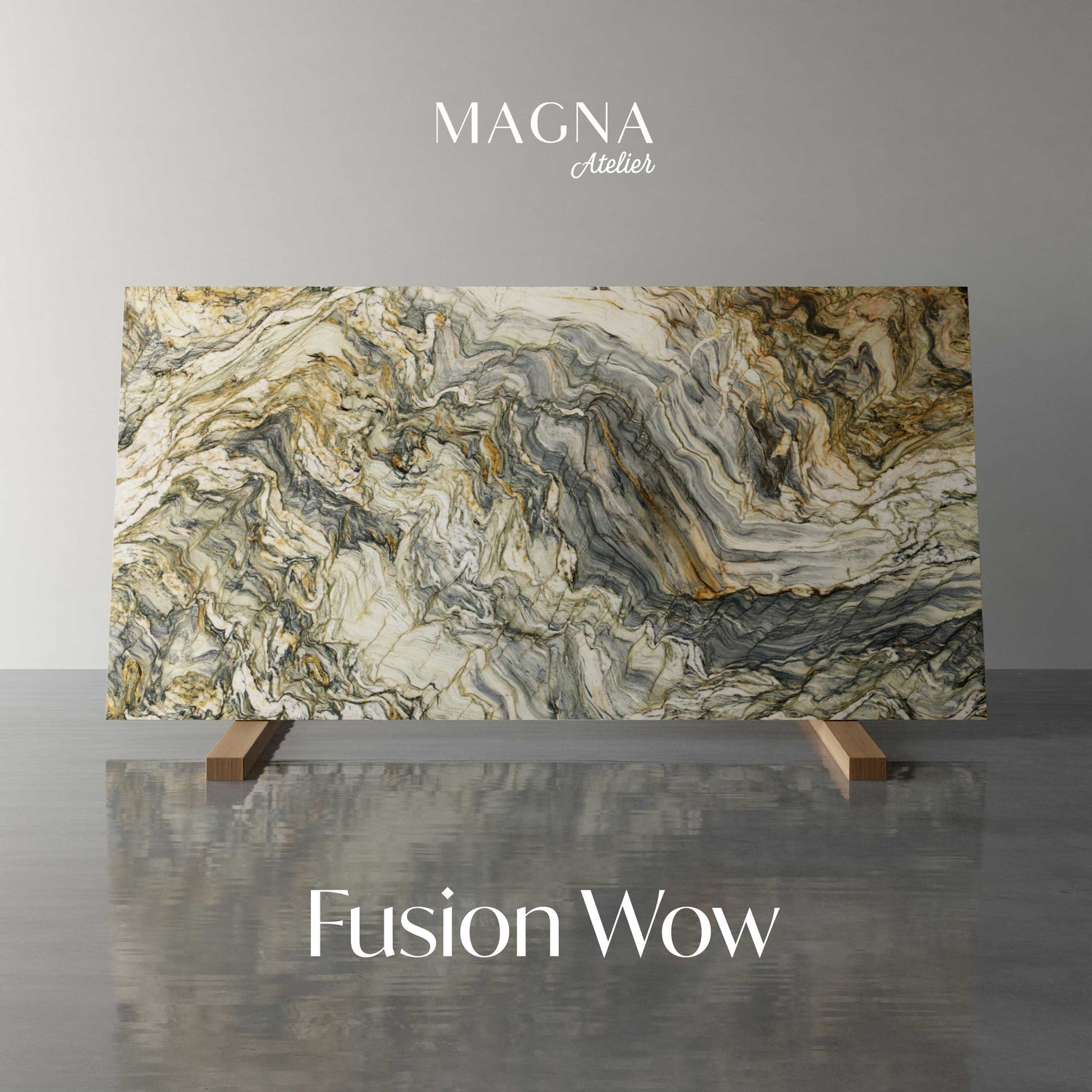 Fusion Wow trägt seinen Namen zu Recht – ein Naturstein voller Energie, Bewegung und Farbe. Seine spektakuläre Maserung vereint goldene, graue und blaue Linien zu einer dynamischen Komposition, die jedem Tisch eine unverwechselbare Präsenz verleiht.