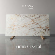 Lumix Crystal ist die Essenz aus Licht und Stein – ein transparenter Quarzit mit zarten Schattierungen in Weiß, Grau und Gold. Er fängt das Licht ein und reflektiert es auf elegante, fast schwebende Weise. Jeder Tisch aus Lumix Crystal wirkt wie ein funkelndes Kunstobjekt der Natur.