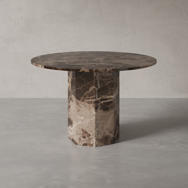Ein 320 Millionen Jahre alter dunkelbrauner Stein, der in der Nähe von Valencia in Spanien seinen Ursprung findet. Mit seinen warmen braunen Grundfarben und weißen Adern hat der Emperador Marron Marmor ein elegantes und natürliches Muster. Aufgrund seiner Empfindlichkeit gegenüber Säuren und Kratzern ist es wichtig, direkten Kontakt mit Speisen und Getränken zu vermeiden und den Marmor regelmäßig mit Imprägnierung zu schützen.