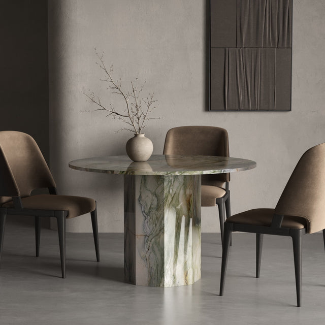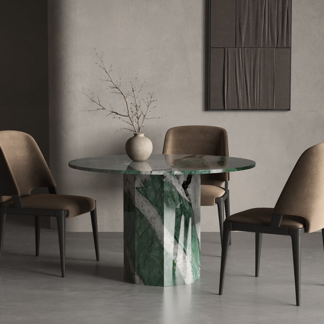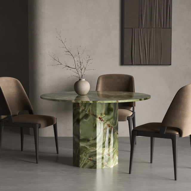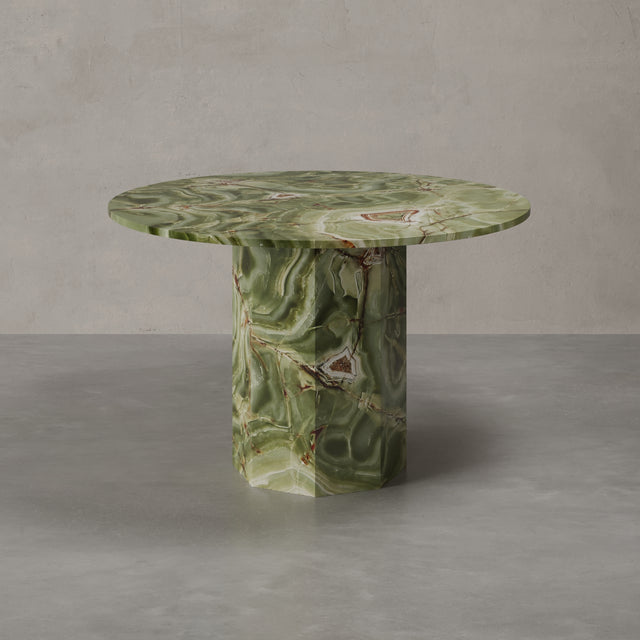 Der Green Onyx wird im Iran abgebaut und ist jünger als 1 Million Jahre. Dieser kristalline Naturstein besticht durch seine unverwechselbare Ästhetik, die von weißen, goldenen und ockerfarbenen Adern durchzogen ist. Bitte beachten Sie, dass der Green Onyx empfindlich gegenüber Säuren ist; wir empfehlen daher stets die Verwendung eines Untersetzers für Getränke und Speisen, um seine Schönheit zu bewahren.